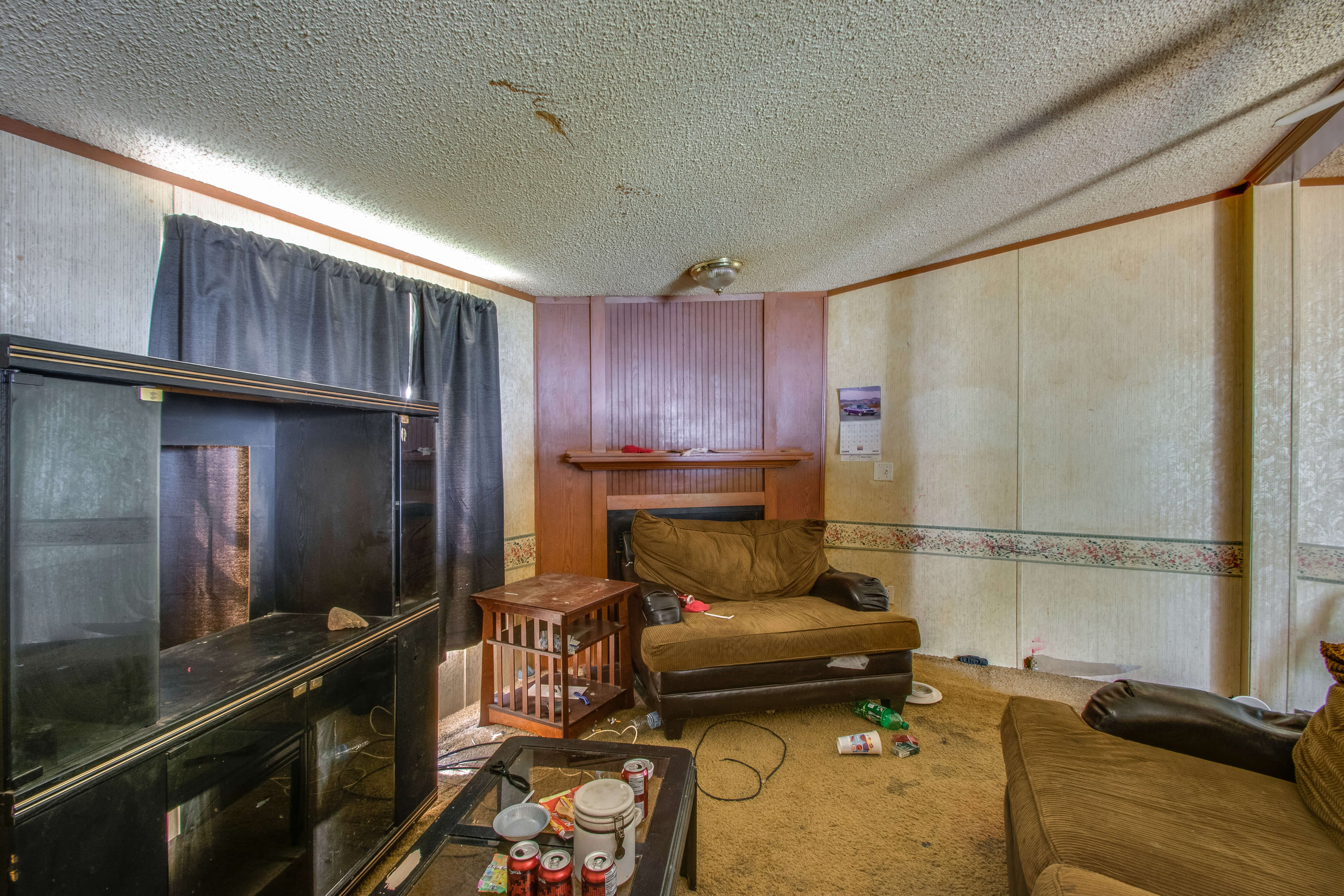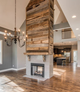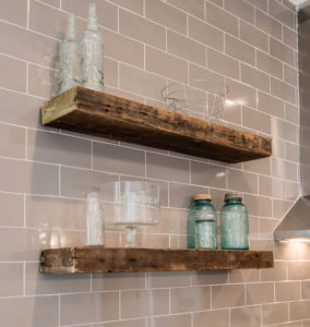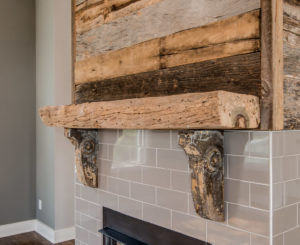 Aerial installed a custom stained glass window, designed by a local Nashville artist, in the front of the house. Aerial also provided historic corbels to support the mantel over the fireplace and wrapped the floor-to-ceiling fireplace in repurposed barn wood from a local vendor. The peek-a-boo fireplace separates the dining room from the living room while making the entire downstairs feel open and connected. The floating barn wood shelves in the kitchen are from a historic building in downtown Nashville that was built in 1859.